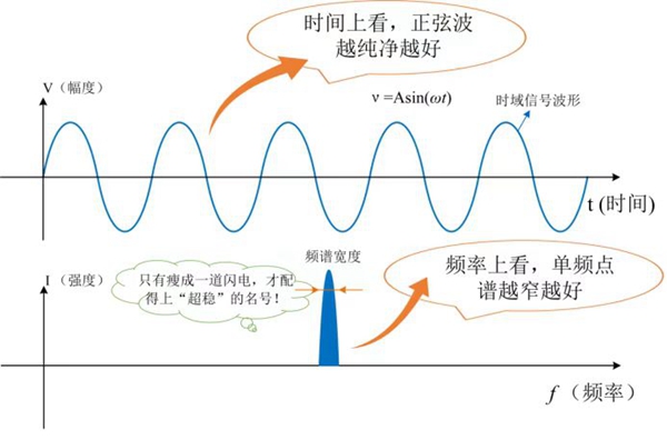 從時間尺度上看,超穩微波信號是指周期連續、頻率單一的正弦波;而從頻率尺度上看,超穩微波信號是頻譜寬度很窄的信號。如圖2。時間上信號的波形越逼近正弦波,頻率成分就越單一、穩定度就越穩定,頻域上信號的譜線寬度越窄,相位噪聲就越低。