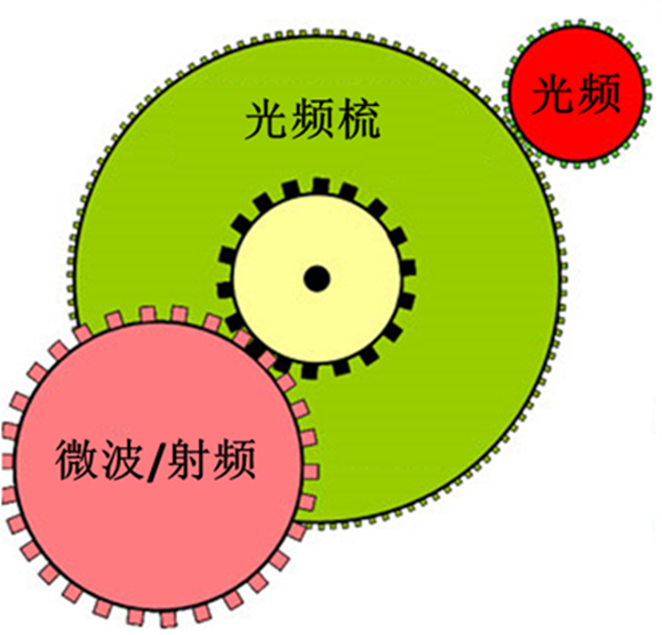 雖然激光的頻率很穩定,但是激光的頻率卻很高,和微波頻率相比,一般要差5、6個數量級。因此無法直接對激光進行分頻而抑制了光生微波技術的發展。而在2000年, Theodor W. H?nsch教授和John L. Hall教授發明了光學頻率梳[3][4],就像一個齒輪組(如圖 9),既可以嚙合激光頻率,又可以連接微波頻率,可以直接對超穩激光進行分頻至微波頻率,這項技術的發明使得光生微波成為可能。這兩位科學家也因為發明光梳而分享了2005年諾貝爾物理學獎。