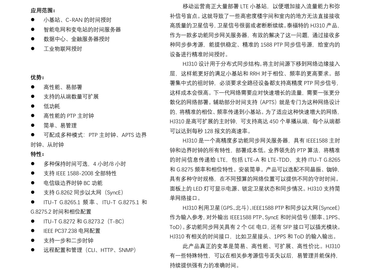 HJ310設計用于分布式同步結構。將主時間源下移到網絡邊緣接入層,這樣能更好的滿足小基站和RRH對于相位、頻率的更高要求。部署集中式的祖時鐘,必須要求全路徑設備都支持高精度PTP同步信號,這樣成本會很高。下一代網絡需要應對快速增長的流量,需要一張更分散化的網絡部署。...